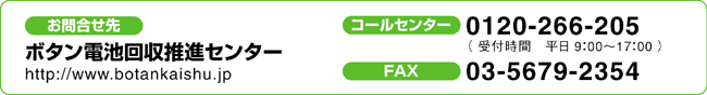 ●回収対象電池・・・酸化銀電池(型式記号SR)、空気電池(同PR)、アルカリボタン電池(同LR)で、上記の回収処理事業推進会社が製造・販売するブランドの商品に限ります。 FDK株式会社/スぺクトラムブランズ ジャパン株式会社/セイコーインスツル株式会社/ソニー株式会社/東芝電池株式会社/株式会社ネクセル/パナソニック株式会社/日立マクセル株式会社/ファルタ・マイクロバッテリー・ジャパン株式会社/株式会社三菱電機ライフネットワーク